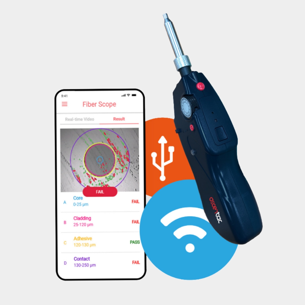Ascentac OFI400 系列光纖端面檢視器,用於檢測光纖連接埠內及光纖跳線端面之清潔,使用者可透過檢視器得知端面是否受污染或損壞,進而排除光纖鏈路中最常發生的接頭故障問題。