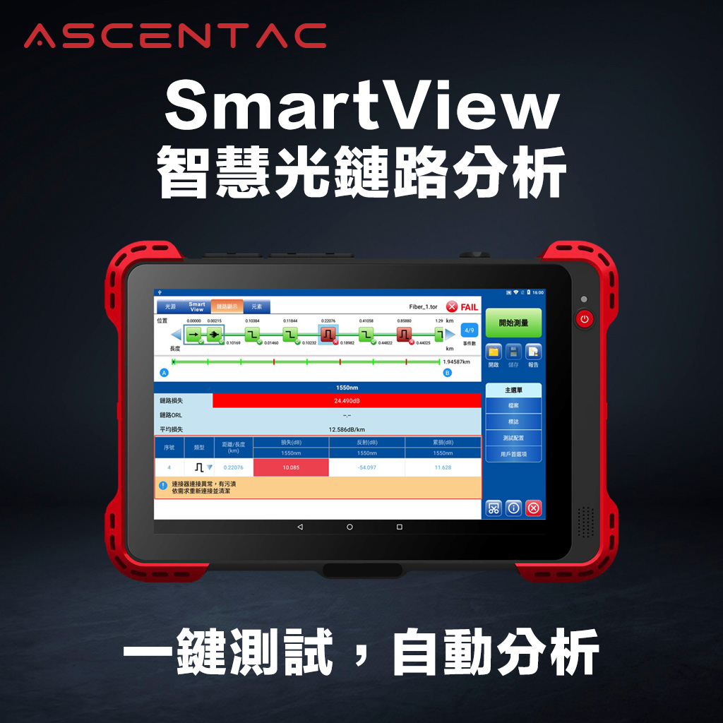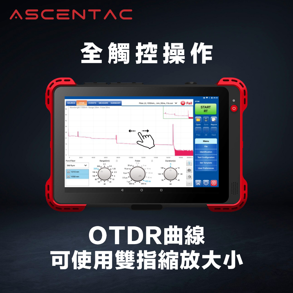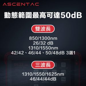 Ascentac OTDR710MAX 系列為光時域反射器,是一款用於檢測和紀錄光纖網路狀態的手持量測儀器,其高解析度搭配極短盲區確保光纖鏈路量測獲得準確的分析,保留耐用功能按鍵,且具備可觸控式螢幕。 另外,內置可拆式光功率計、可見光源故障定位器、網線尋找與對線器。