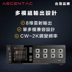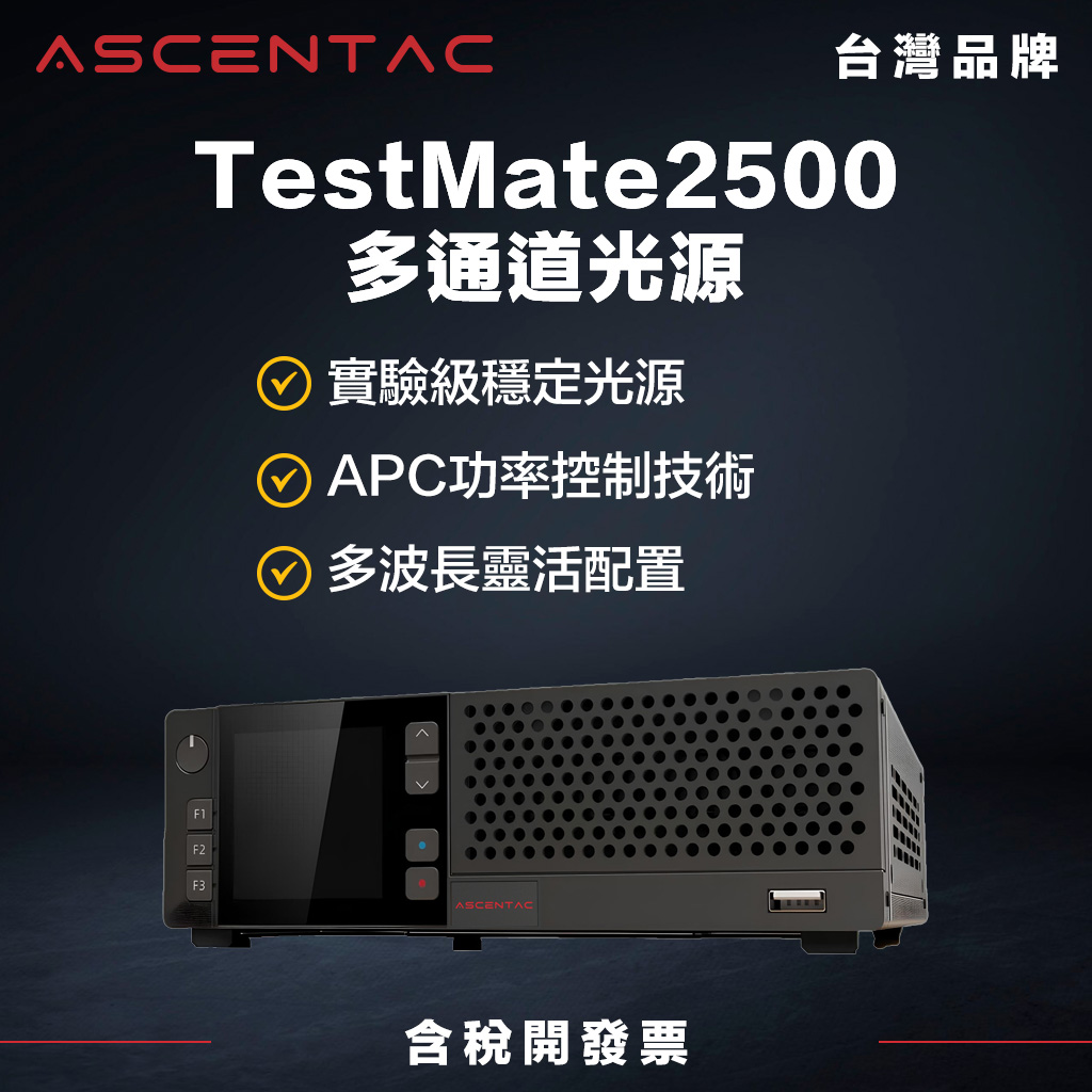 Ascentac TestMate2500 系列之多通道光源採用自動功率控制 (APC) 技術,高功率機型會有溫度控制電路,確保輸出波長和功率穩定度,並有多種雷射波長可以選擇,可廣泛應用於光學元件、CWDM 系統測試。