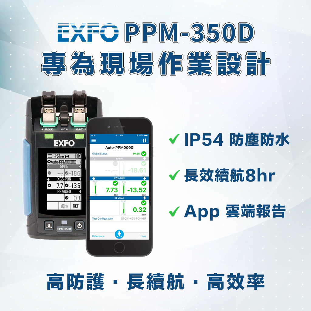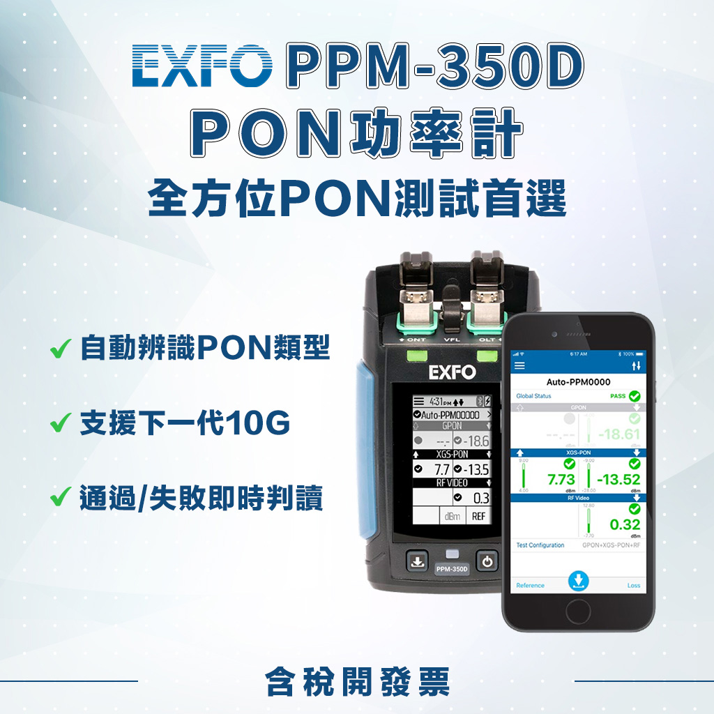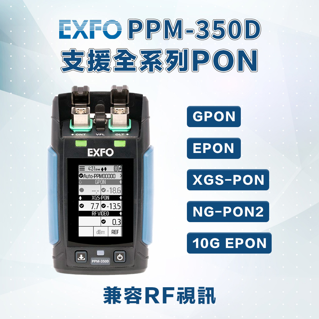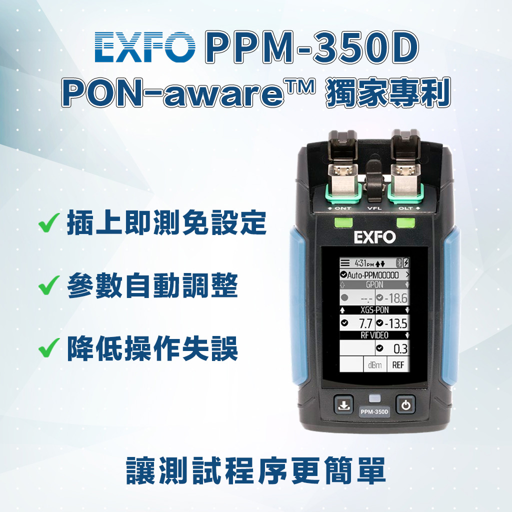 EXFO PPM-350D 具備 PON 感知功能,可自動偵測網路類型並調整測試參數,支援 GPON、EPON等傳統與新一代 PON 技術。