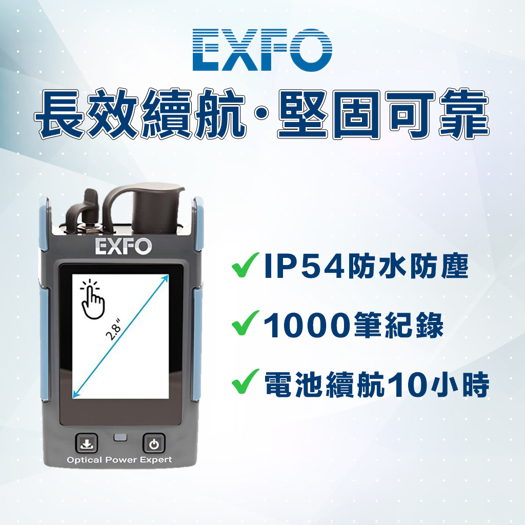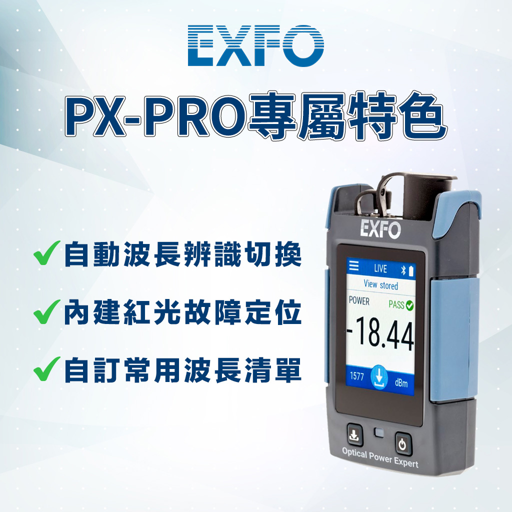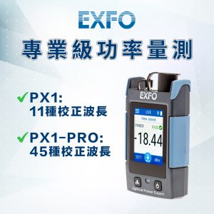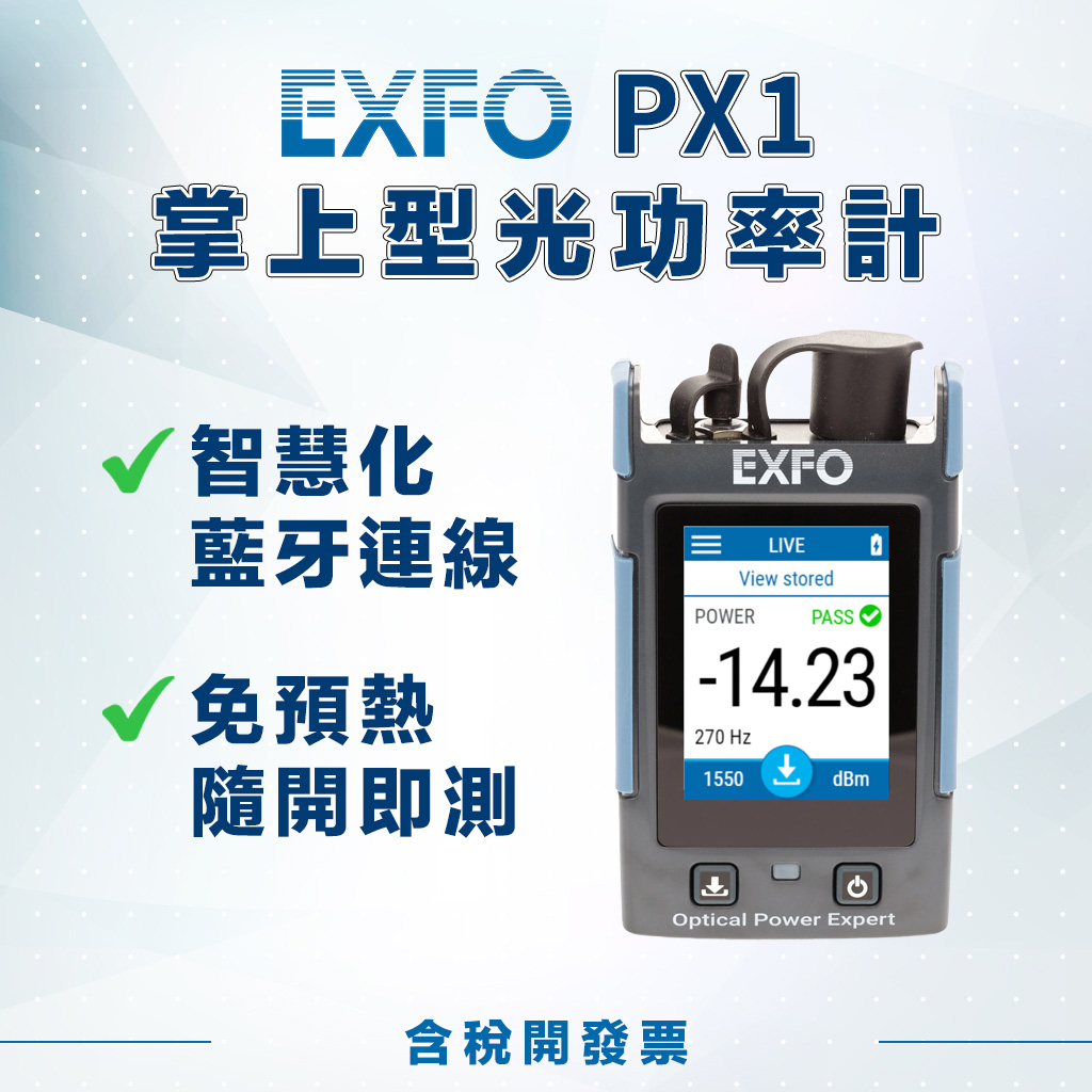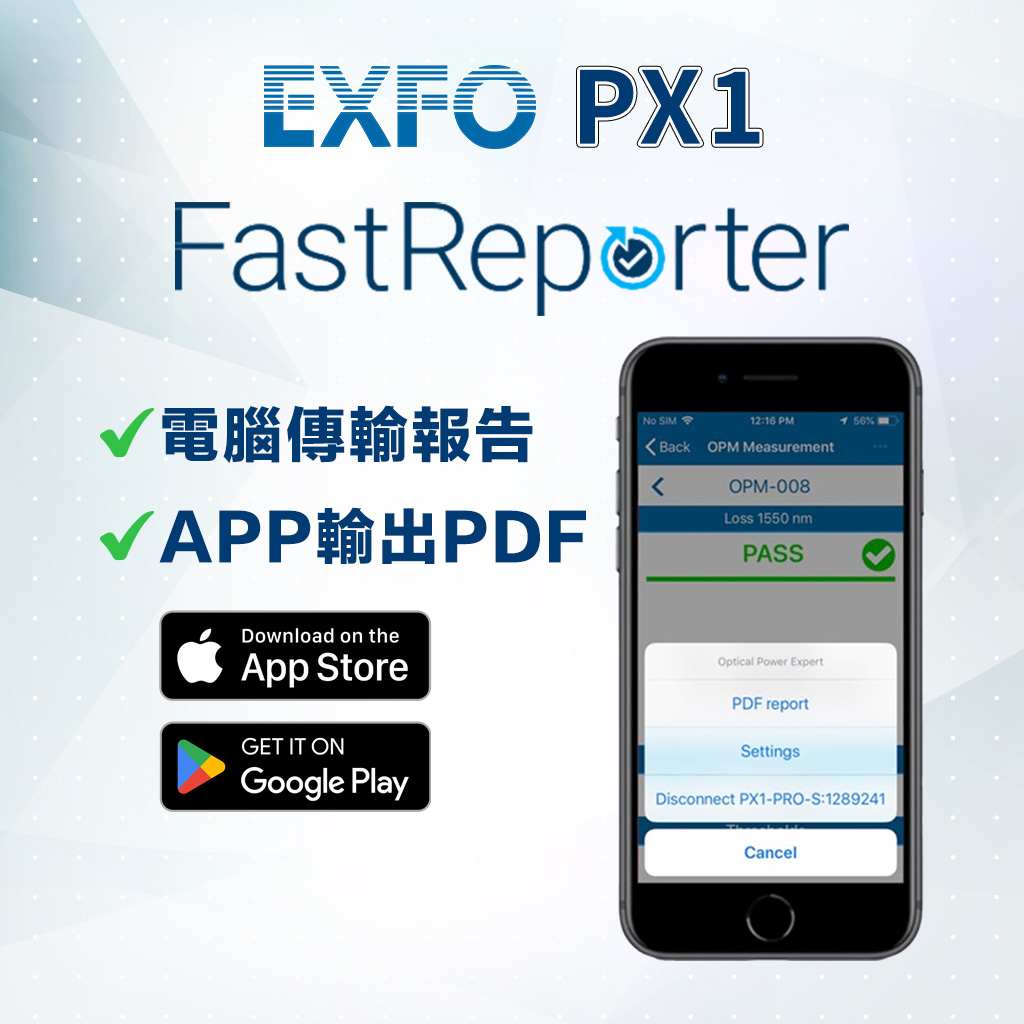 EXFO PX1 是一款輕巧的智慧型光功率計,具備 IP54防塵防水設計。透過藍牙連接 EXFO Exchange App,可即時上傳測試結果至雲端並產出報告。