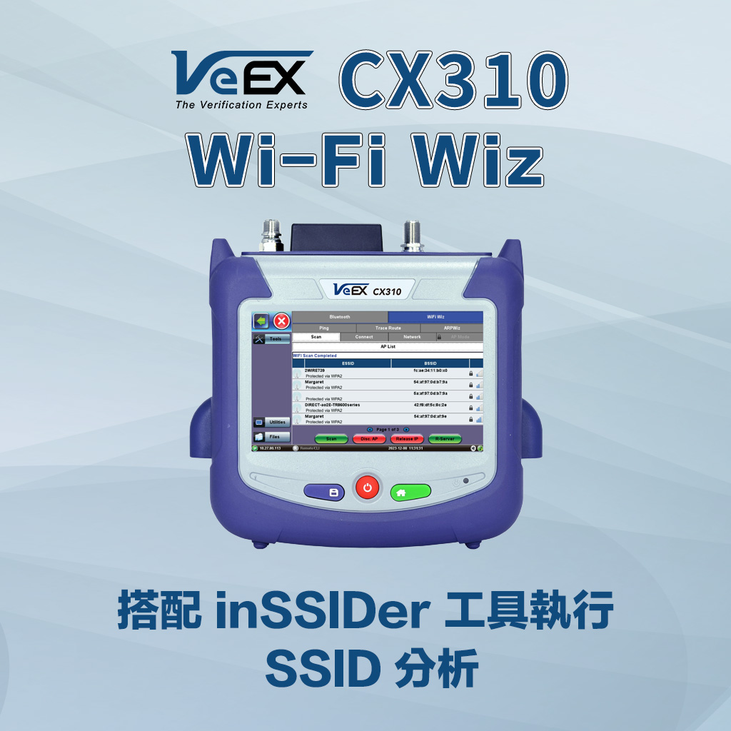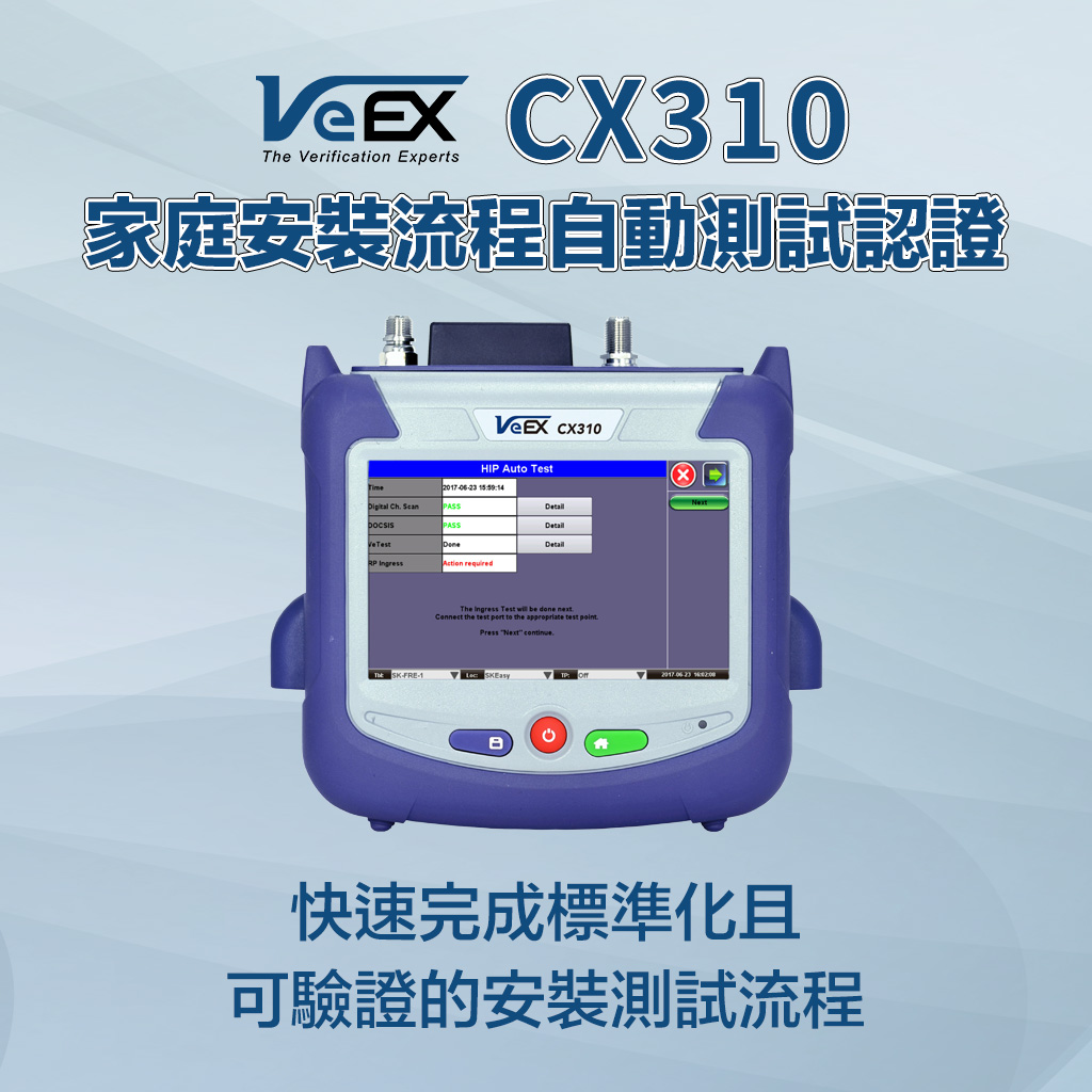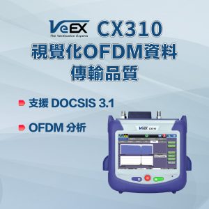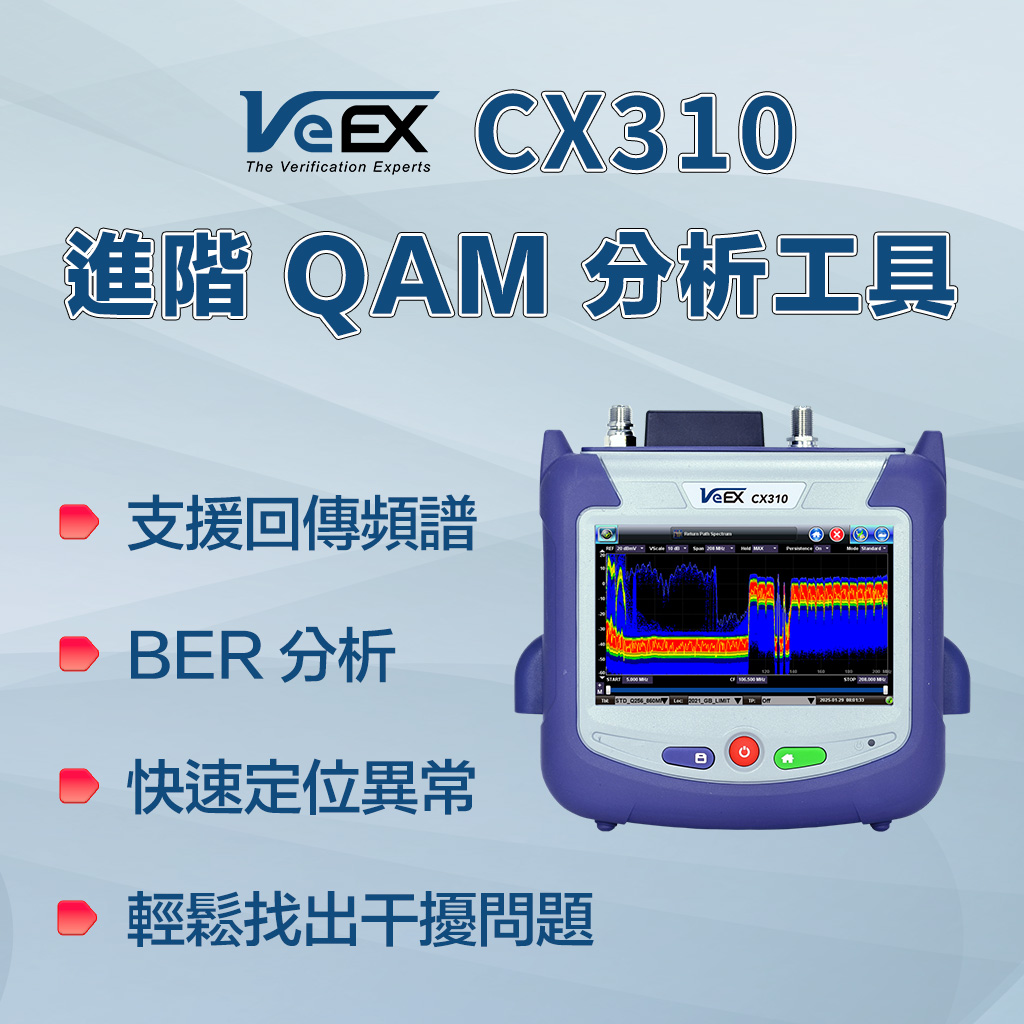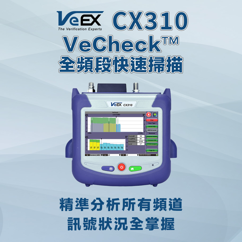 VeEX CX310 是專為有線電視網路設計的 DOCSIS 3.1 手持式分析儀。機身輕巧、攜帶方便,內建 DOCSIS 3.1 數據機,能精準提供 OFDM 訊號分析與 VeTest 傳輸吞吐量測試。