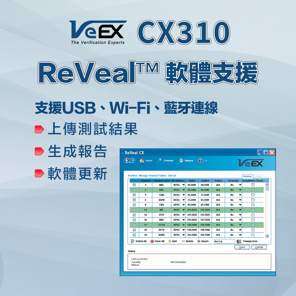 CX310 具備完整的 SLM 功能,包含單一頻道分析、VeCheck 全頻段掃描與上行雜訊掃描。無論是第一線的安裝維護或障礙排除,都是有線電視工程人員最理想的量測工具。