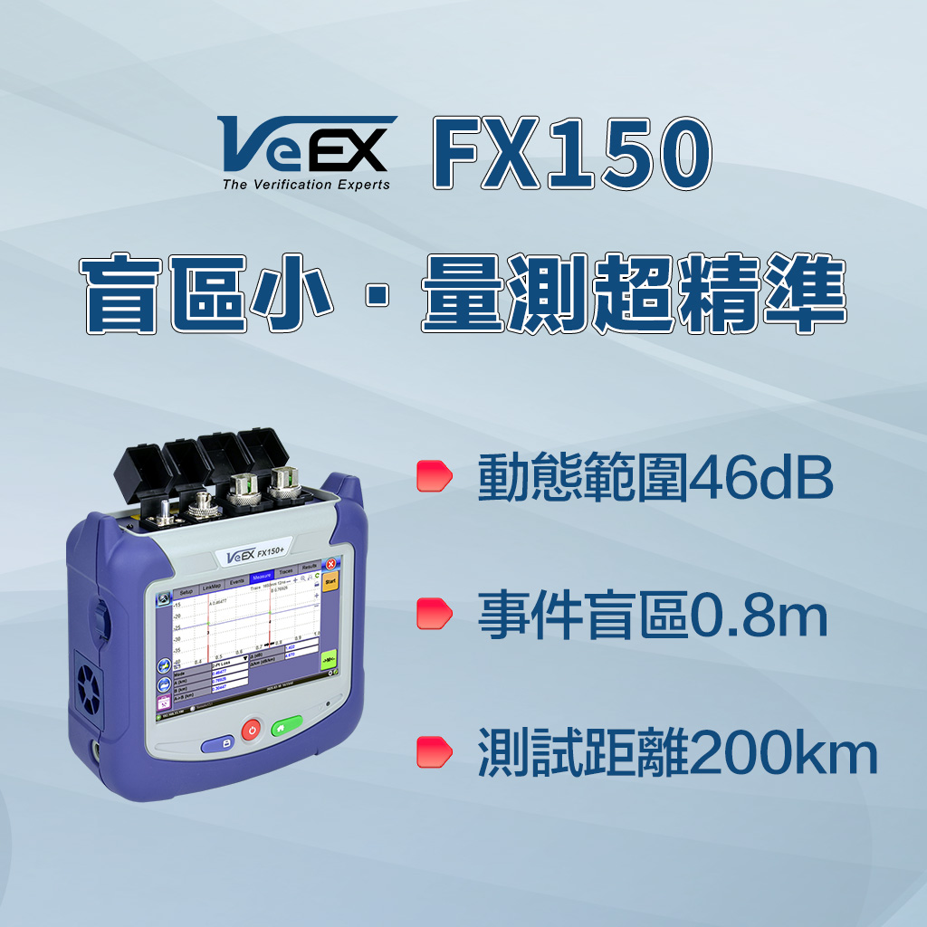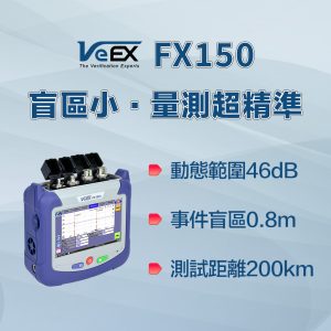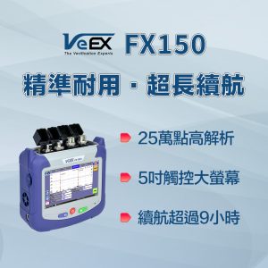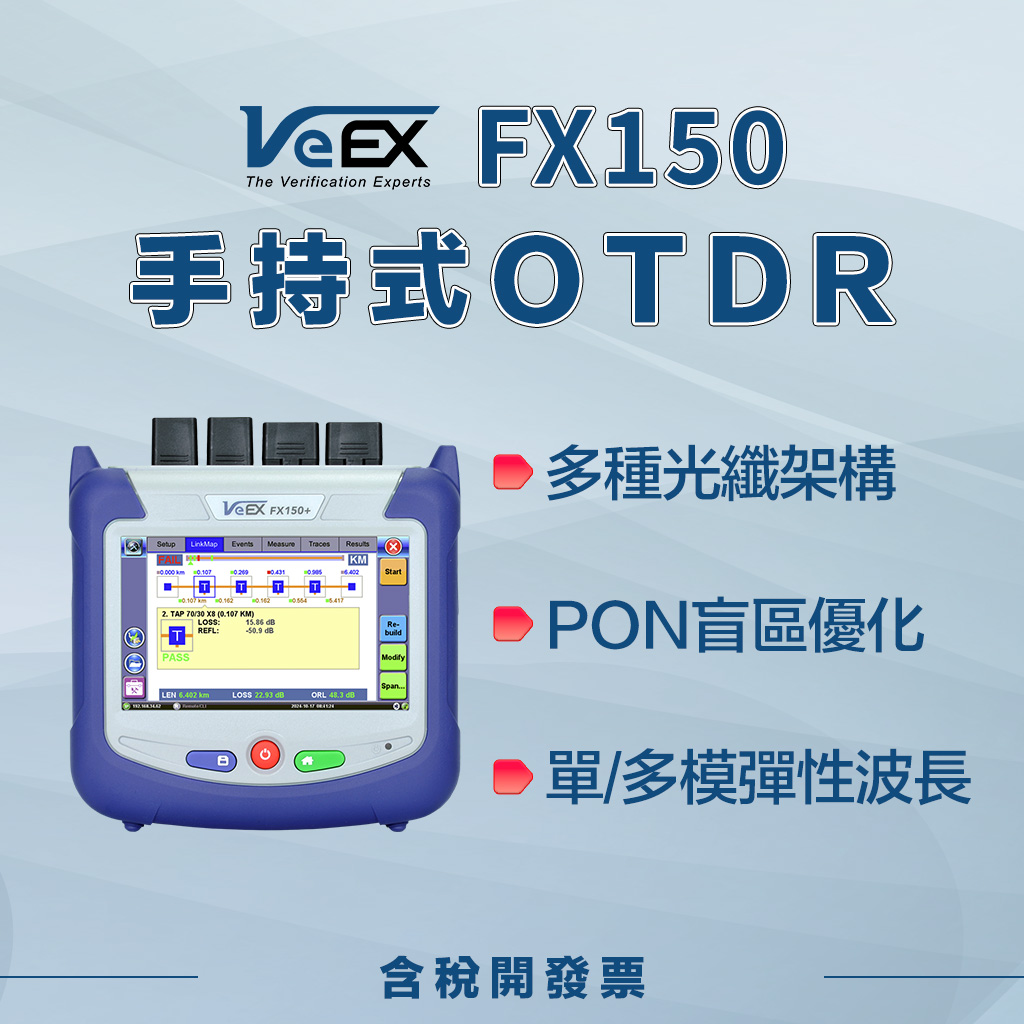 VeEX FX150+ 迷你型 OTDR 採樣點高達 256,000,解析度 3 公分,為 FTTx、行動前傳後傳與光纖網路的佈建、維護與故障排除提供卓越量測精度。此款輕巧便攜的 PON 測試組可整合功率計、光源、光纖端面檢測儀與可見紅光筆等選配功能,大幅提升儀器的多功能性。