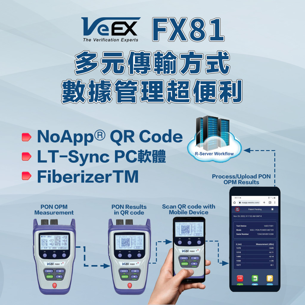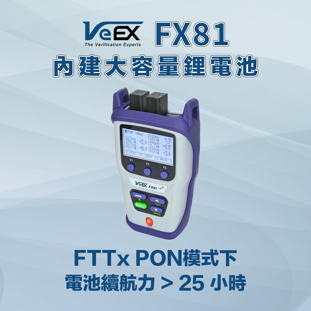 VeEX FX81 光功率計適用於多種 PON 光纖網路的安裝、開通服務與故障排除等,包括 B/GPON、XG(S)-PON、25G PON、EPON 與 10G-EPON。直通設計可同步量測上下行多路訊號,適用於 ONU/ONT (用戶端設備) 驗證,同時也支援非直通/端接模式的 OLT (局端設備) 測試與驗證。